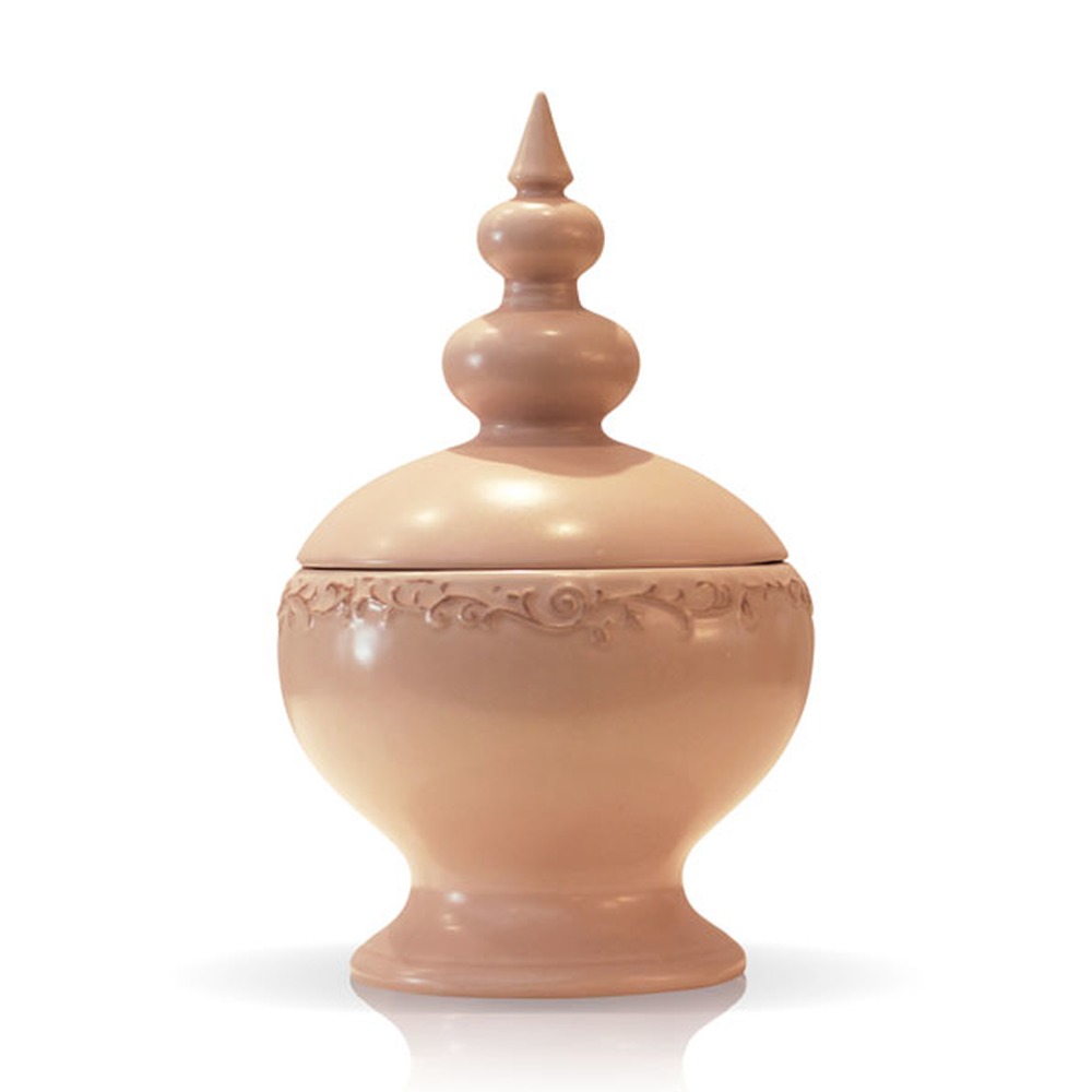 Potiche Rennes Rosa Grande Ceramica, é bem ornamentado e possui detalhes de arabescos, desenho de perolas e argolas. Tem referencia na arquitetura indiana.